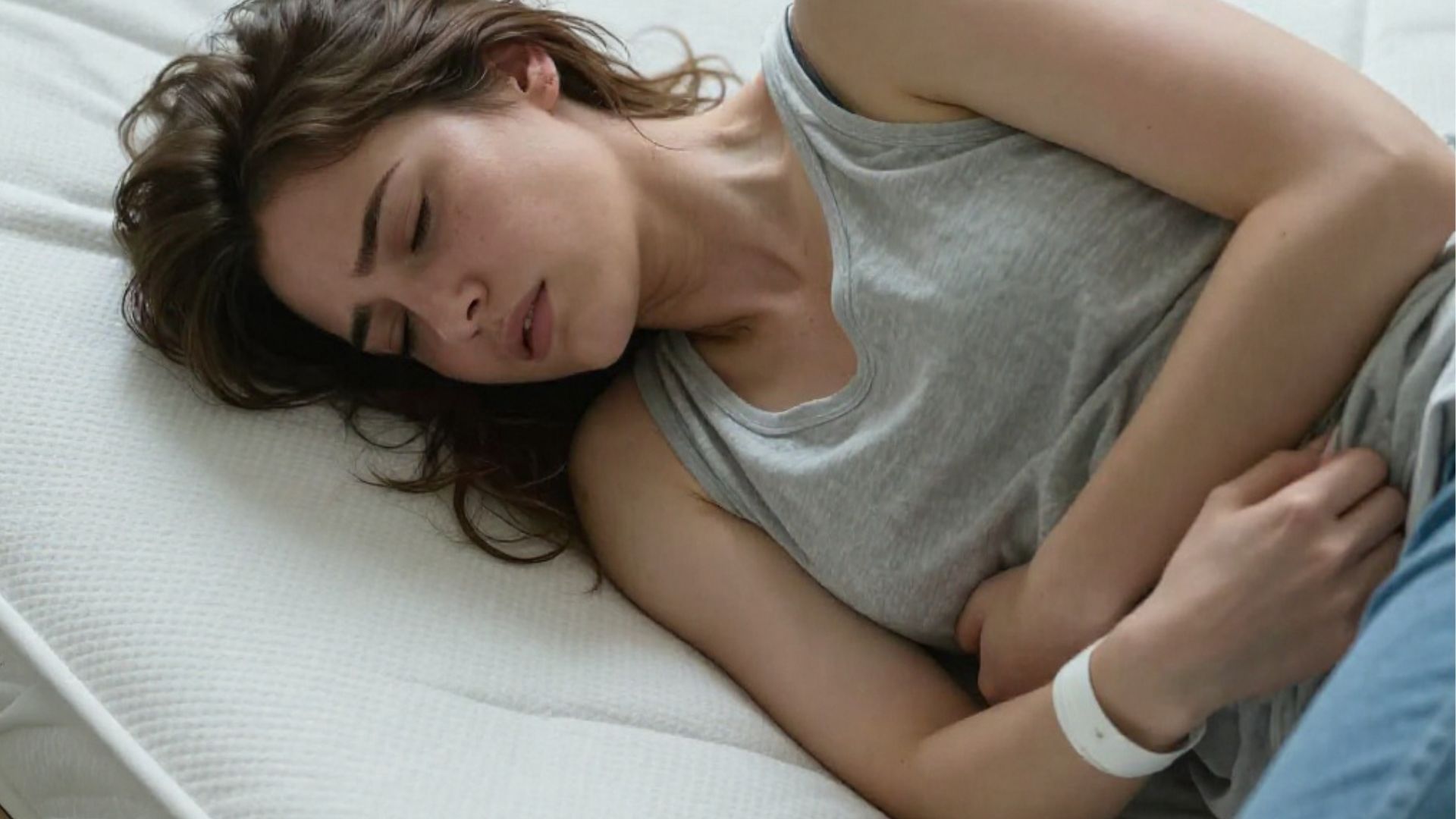 A woman experiencing fatigue and discomfort that may be linked to frequent or irregular menstrual periods.